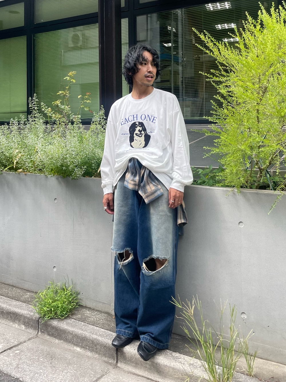 サガラ刺繍のドッグプリントが可愛いロンTにチェックシャツを巻いてこなれ感アップ🐕 男女兼用アイテム♪ instagram→@asknowasplus