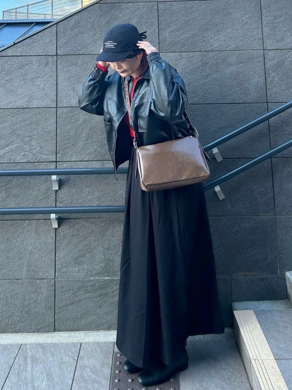 秋らしいレザーや小物と、ちらっと見える差し色の赤がポイントの大人カジュアルコーデ🐈⬛ instagram→@asknowasplus