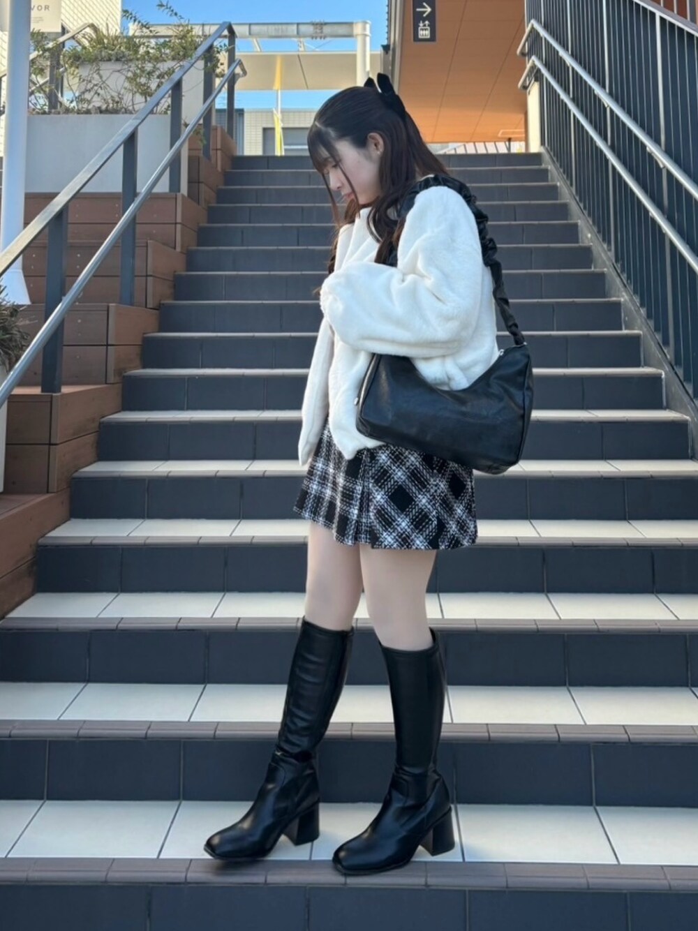 ふわふわファーアウターとチェックスカートの甘め冬コーデ❄️ instagram→@asknowasplus