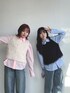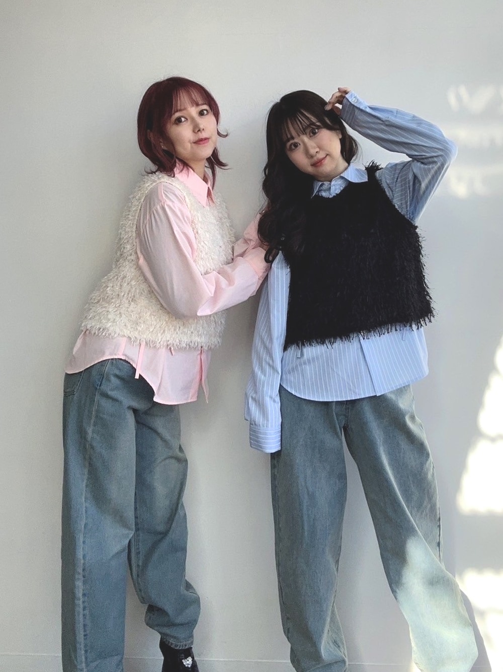 カジュアルなシャツ×デニムにビスチェを重ねた春コーデ🌷 model:もふもふもーさん(左:みみちゃん 右:ととちゃん)