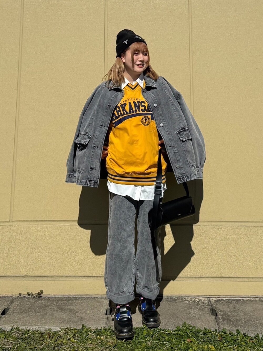 ケミカルブラックのデニムセットアップに、イエローの差し色が映えるストリートコーデ instagram→@asknowasplus