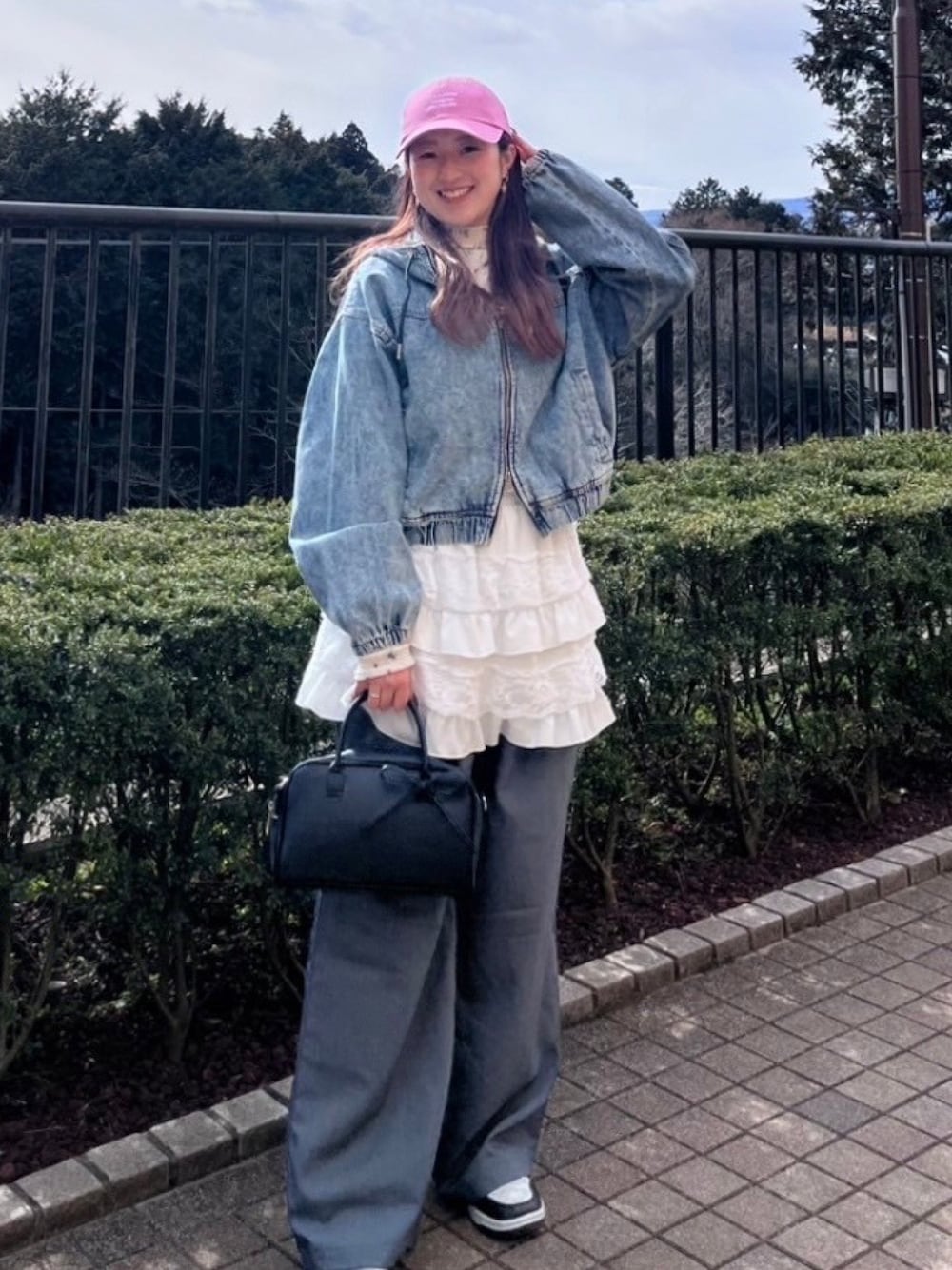 スタイルアップ効果のある短丈ブルゾンをキャップとスラックスでカジュアルに合わせました🌷 フリルスカートをレイヤードして甘め要素も♡ instagram→@asknowasplus