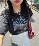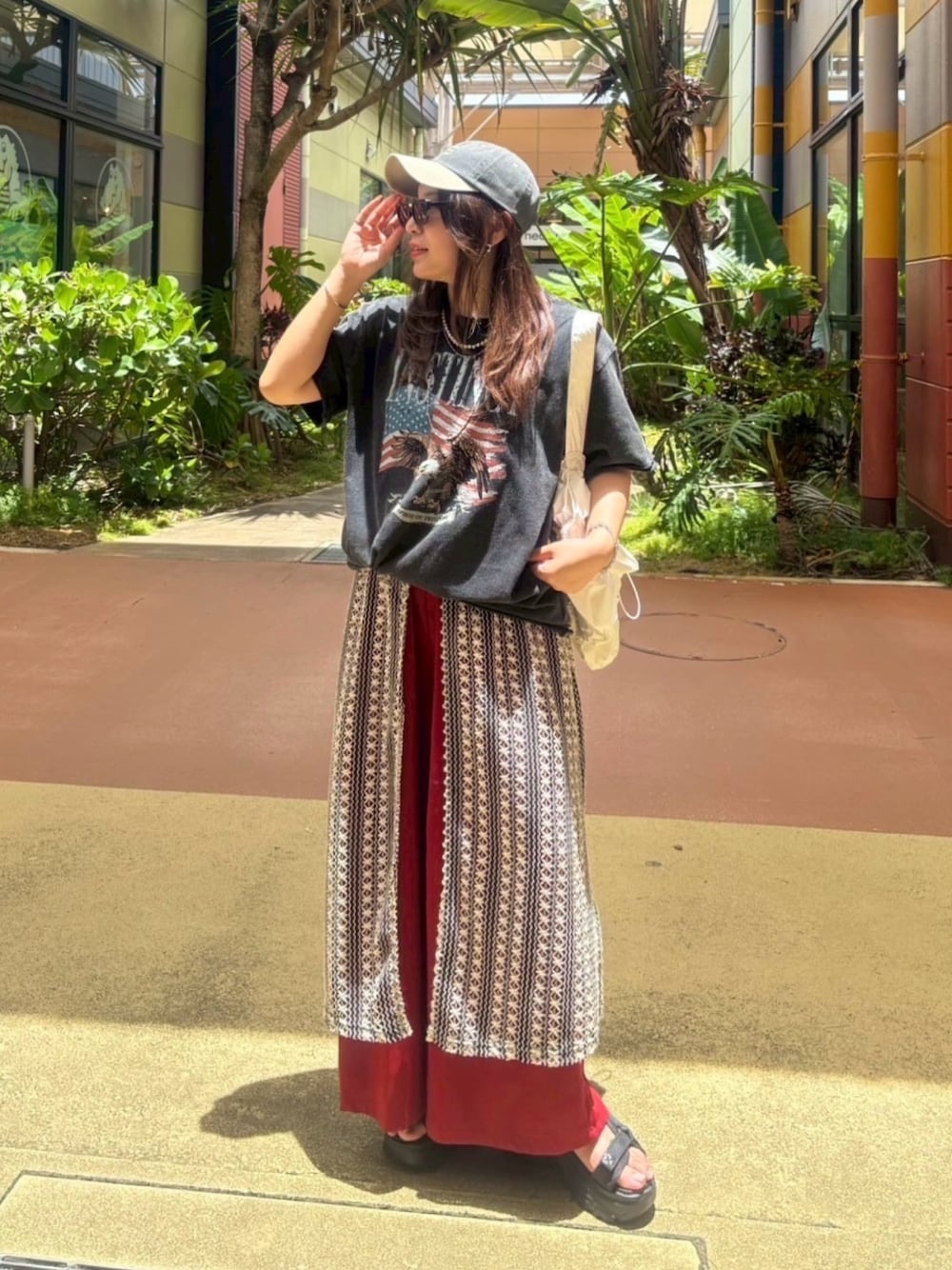 ヴィンテージっぽいTシャツに赤のワイドパンツが映える、キャミワンピレイヤードコーデ♪