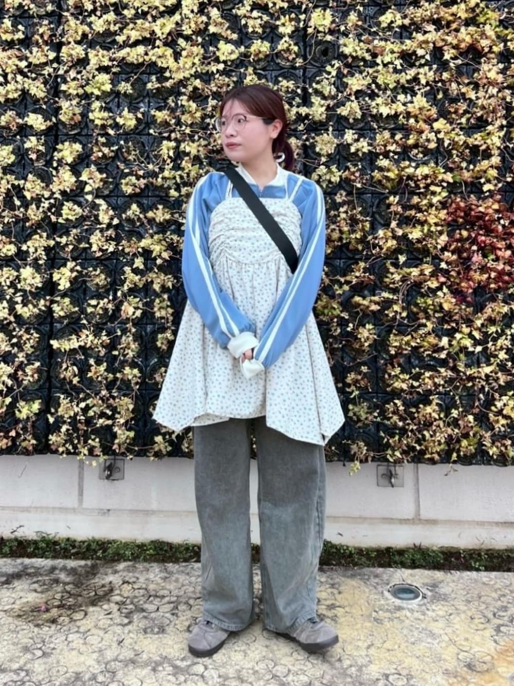 淡いブルーが春っぽい!小花柄キャミワンピとデニムで合わせたちょっぴりガーリーなストリートコーデ🌼 instagram→@asknowasplus