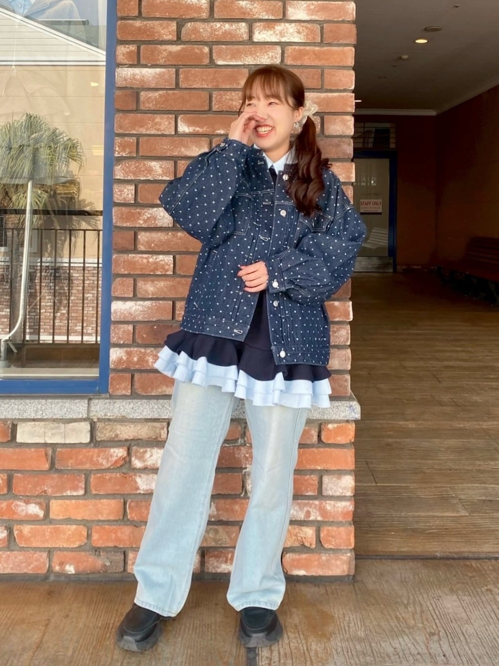 ドットのジャケットとフリルチュニックをネイビーで合わせて統一感のある春コーデ✨ instagram→@asknowasplus