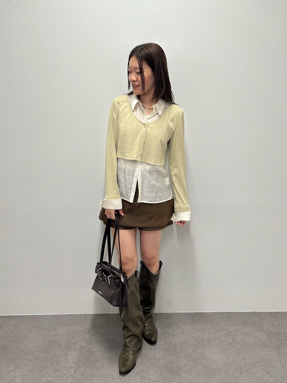 152cm / 骨格ナチュラル / イエベ秋 ダッフィーをイメージしたベージュ系コーデ キャラクターバウンドの参考にぜひ🫶 ⚪︎トップス 見た目よりもサラッとした素材なので今からすぐに着用できます🍂 流行りのレイヤードスタイルが1枚で完成するのが嬉しい◎ シャツのボタンは下は2つくらいあけるとバランス良く着られます! ⚪︎スカート 柔らかいスエード風の生地感で履き心地も👌 裾からチラッと見えるショーパンが細見えポイントです! ベルト付きでウエストも調節できるので小柄さんにもオススメ! 普段フリーサイズ大きく感じがちですが、ウエスト調整できたので、私もリアルバイしてます♡ ⚪︎バック 500mlのペットボトルが入るサイズ感です。 スリムなデザインなのでカジュアルからキレイめまで幅広いテイストに合わせられます◎