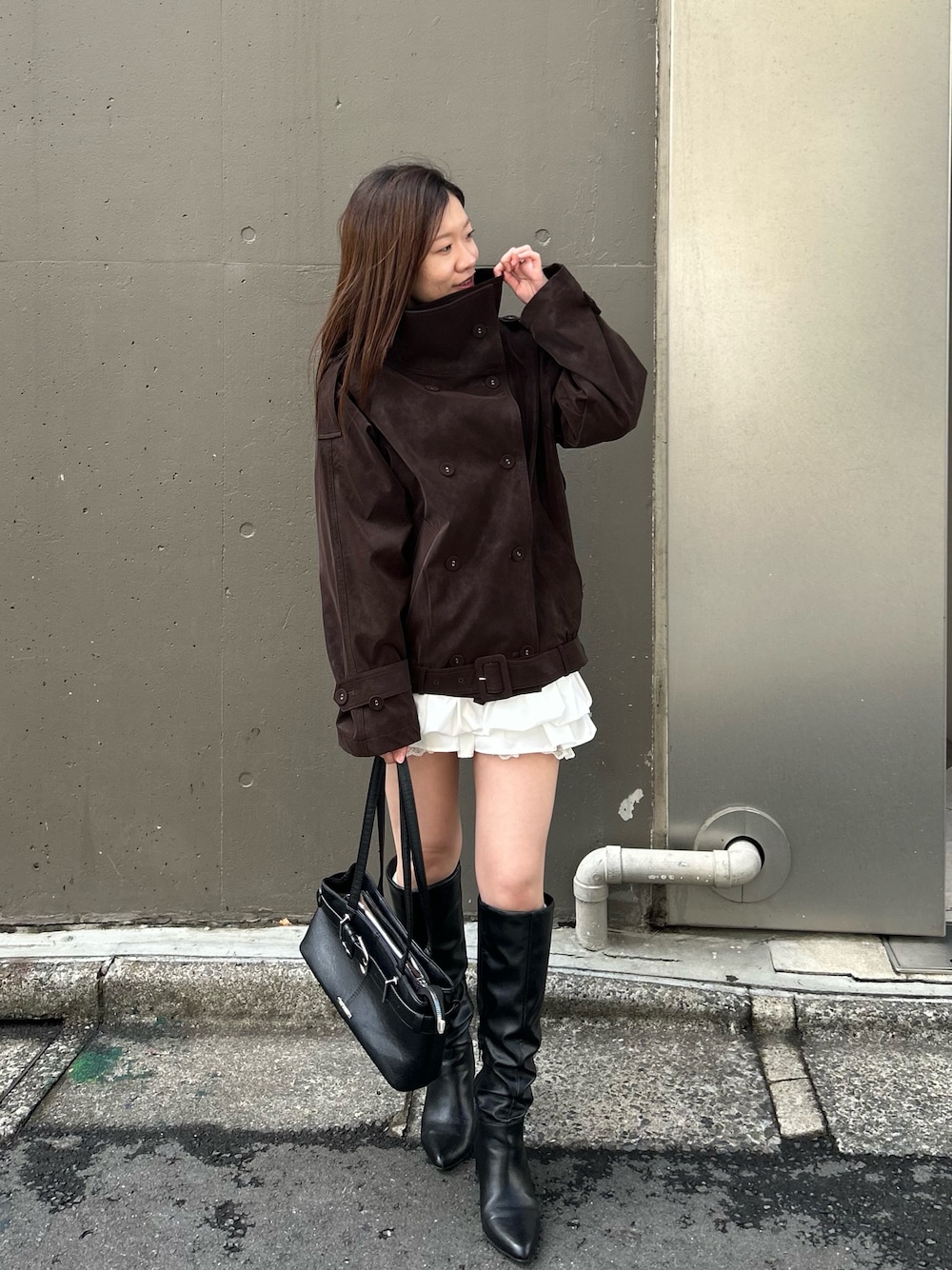 152cm / 骨格ナチュラル / イエベ秋 ⚪︎トレンチ 大きめの襟が印象的なトレンチコートです。 襟を立てて着るのが今年らしくてオススメです! 152cmでお尻が半分くらい隠れる着丈なので、小柄さんでもスッキリ着ていただけます◎ ブラウンはスエードのような柔らかい素材感です。 光の当たり方によって色味の見え方が少し変わるのが、オシャレ見えして好きなポイントです!