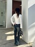152cm / 骨格ナチュラル / イエベ秋 ⚪︎トップス 柔らかい素材で着心地抜群のマルチwayトップスです。 前を開けてカーデとしてや、閉じてトップスとしてはもちろん、首元の紐の使い方次第で雰囲気を変えられる1着◎ 袖がフレアで手が長く見える所も推しポイントです! ※サンプル着用のため、実際の商品は1周りほど全体的にゆとりがあるサイズ感になります。 ⚪︎ ボトム (152cm / Sサイズ着用) 生地が柔らかくて履きやすい+脚のラインが綺麗に見えるフレアデニムです。 裾のラインストーンが、太陽や光に当たるとキラッと光るのが可愛いアイテム! 152cmで5cmくらいのミュールと合わせると、バランス良く着られました◎ ウエストは普通に着用もできますが、 私は1回折って後ろから安全ピンで留めて折返し風にしました✍️