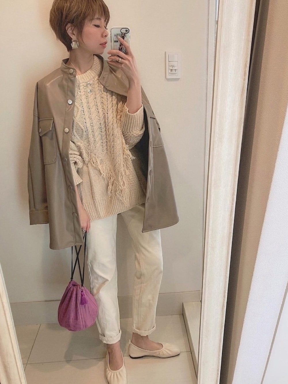 asmのカバーオール「【2021S/S new arrival】フェイクレザーバンドカラービックシャツジャケット」を使ったコーディネート