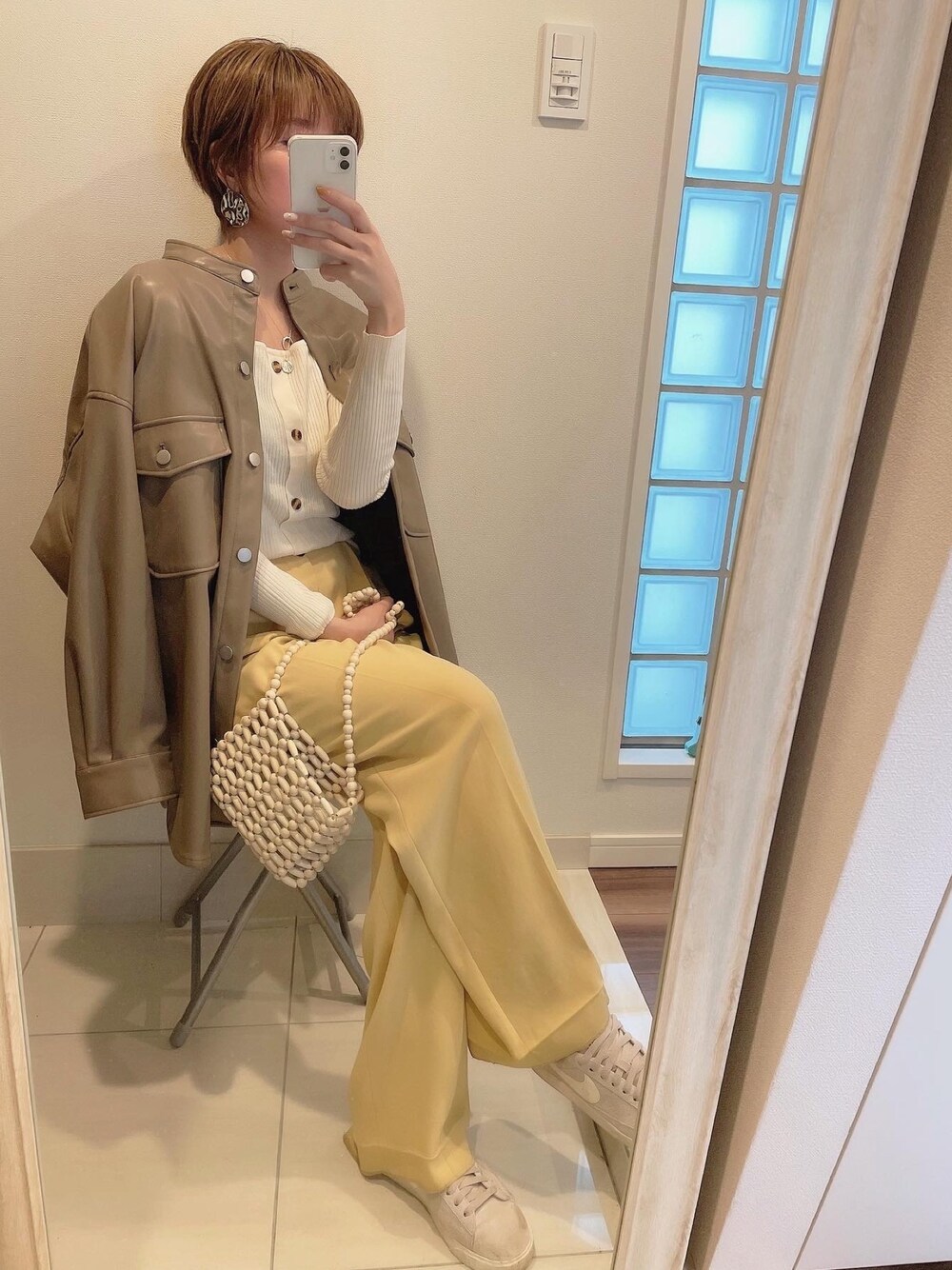 asmのカバーオール「【2021S/S new arrival】フェイクレザーバンドカラービックシャツジャケット」を使ったコーディネート