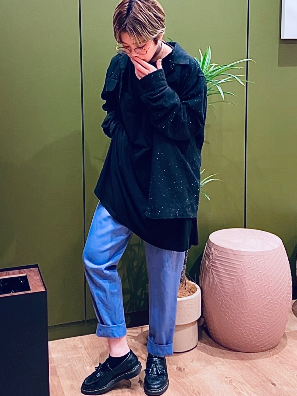 着用コーデ:4件ラベンダーパープルの古着スラックスを、黒で固めます。 アクセントでパープルいれるのはロマンティック♡ 今回はメンズライクでだぼっとビックサイズです。 この背景がテンプレートになりそう👌