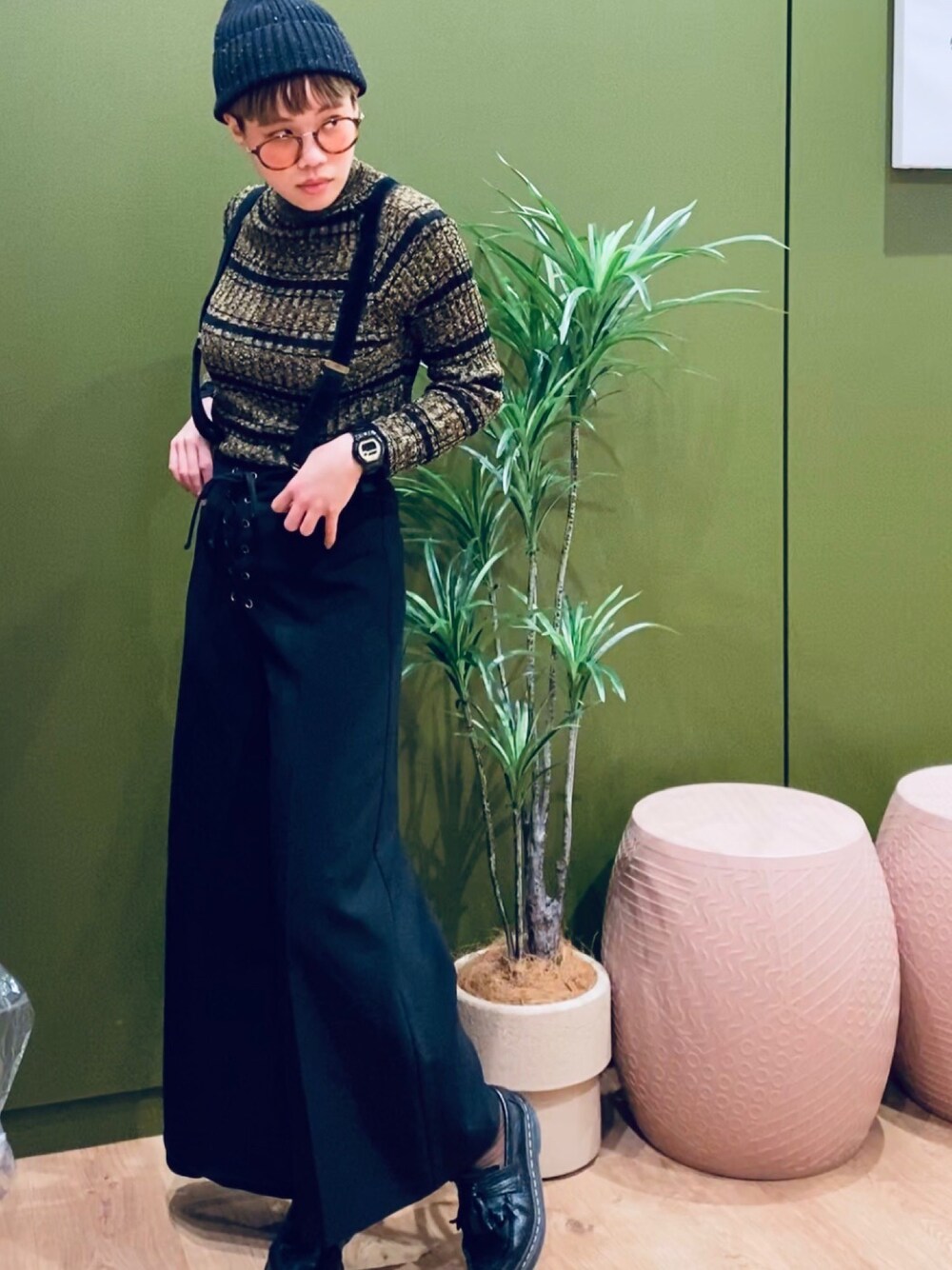 ご閲覧ありがとうございまし🙇‍♀️ ニットキャップ! サスペンダー! メガネ! コートを着ると、結局外では同じになるという現象をなんとかしたいので、 アウターにメリハリをつけたいです!