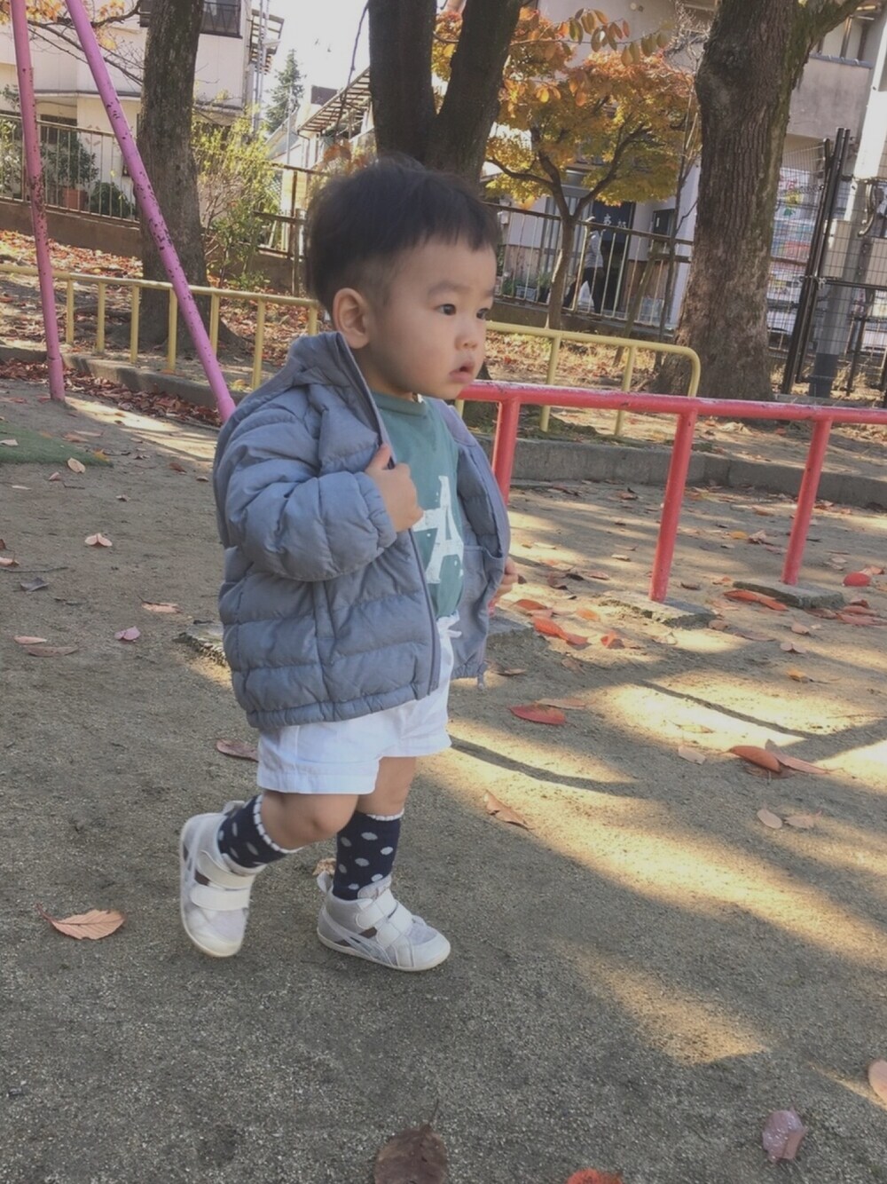 ダウンを羽織らせましたが 全然必要ない程いいお天気☀️ 公園までお出かけ!! してから気づきました😅 公園に白いパンツは向きませんね😱🙏🏻 砂まみれになったパンツを 今からお洗濯です😔✊🏻