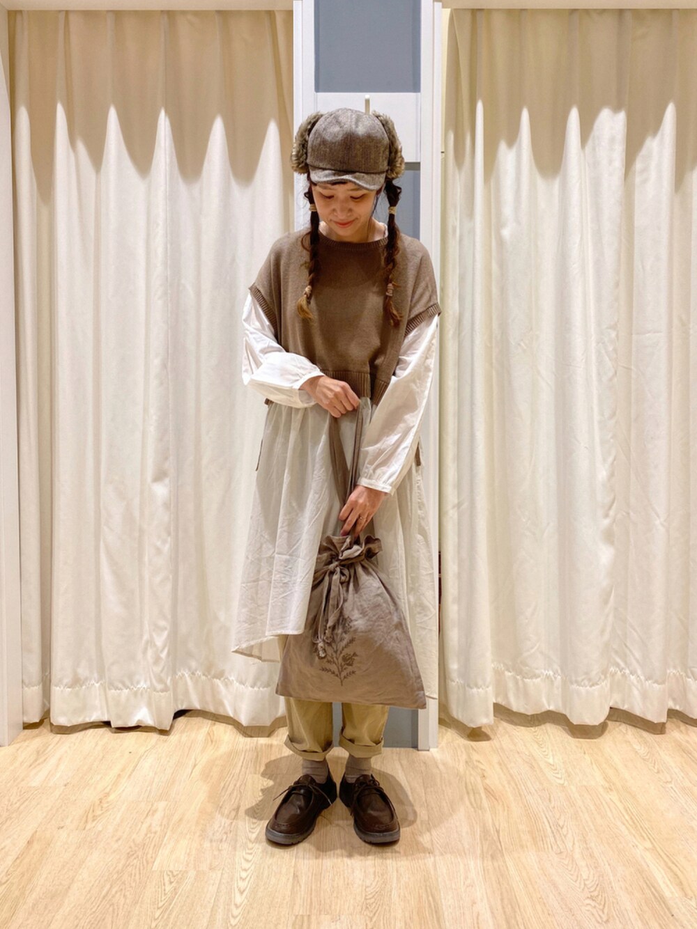 ご覧いただきありがとうございます♪ 一枚でコーディネートが完成するドッキングワンピースを着てみました。 コーデュロイのパンツと合わせて、ナチュラルに。 大好きなモカ色コーデです。 ご来店お待ちしております♪