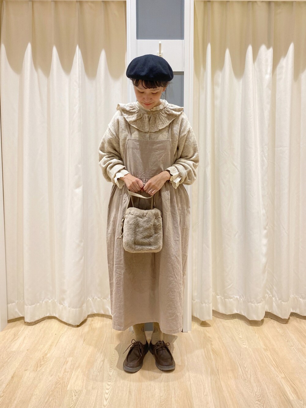 ご覧いただきありがとうございます♪ フリルがかわいいニットとキャミワンピースのコーデです𖦊ັ 後ろのリボンもとてもかわいいので、ぜひ店頭でもご覧になってみてください。