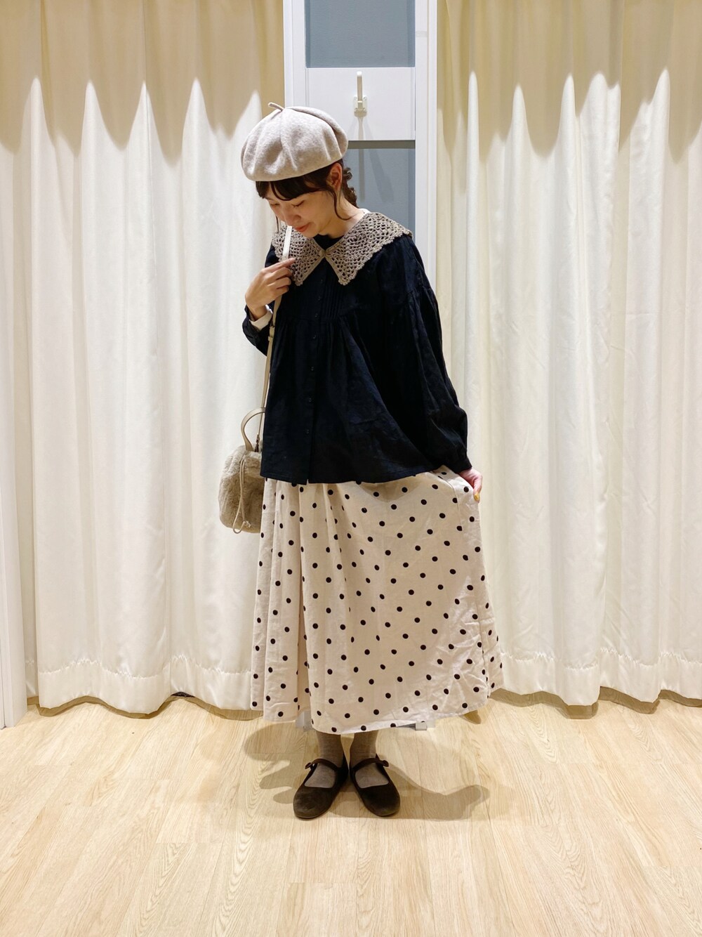 ご覧いただきありがとうございます♩ 今日はドットのスカートをメインにコーディネートしてみました。 ポコポコしたドットがかわいい、ちょっとレトロなスカート、一枚で主役になりとてもかわいいです♪ ぜひ店頭でもご覧になってみてください! ご来店お待ちしております。