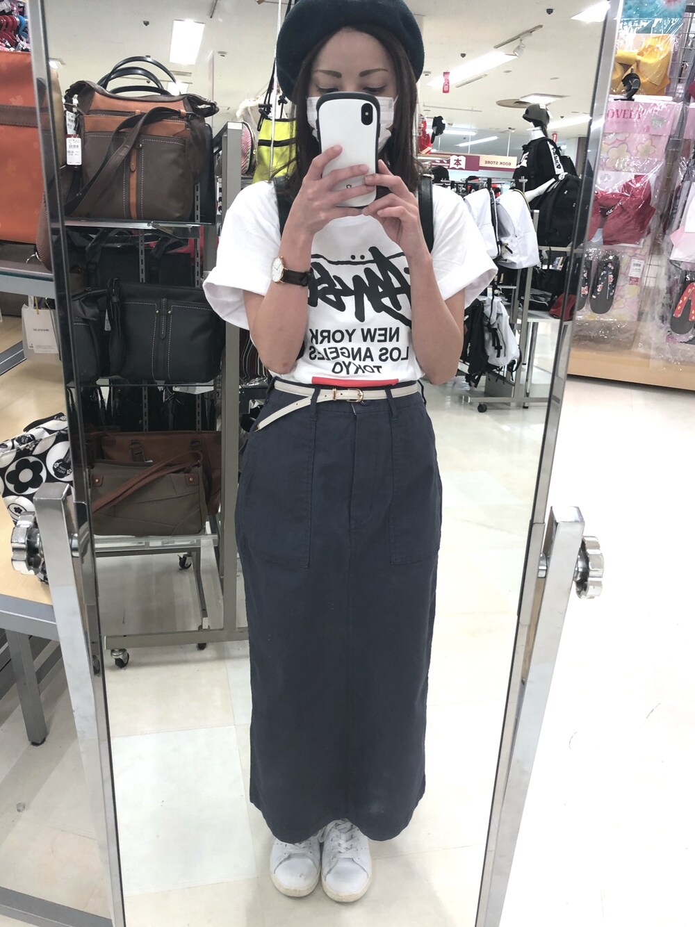 supreme×stussyコラボTシャツとベイカースカート😃❤️ Tシャツはメンズのだけど袖折って着たら可愛いやつ🤤💗💗💔