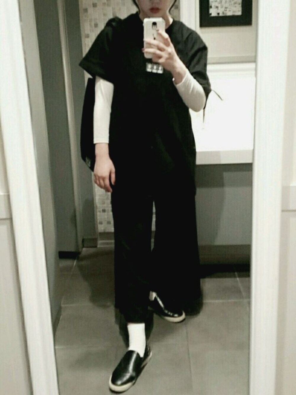 87のロゴTはほんと可愛いし何でも似合う! けどあえてのモノトーンコーデで 赤リップ際立たせて韓国感だしてみた~ 홍대ファッションイメージ笑