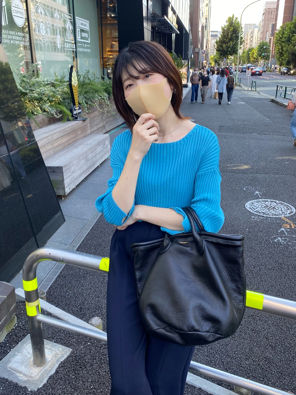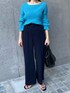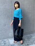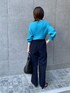 ブルー系のワントーンコーデ。 変形ニットは程よくデコルテラインが出せて抜け感が出るのでお気に入り。 合わせたパンツもシワになりにくくて着心地抜群です。