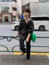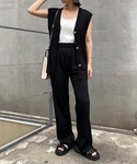 程よいシアー感で夏場の冷房対策や紫外線対策におすすめのラミーシャツ。 わたしは夏でもオールブラックがすき。 合わせたパンツはセットアップで販売してるもの。 それぞれ着回しも効くから一枚GETしておくと便利!