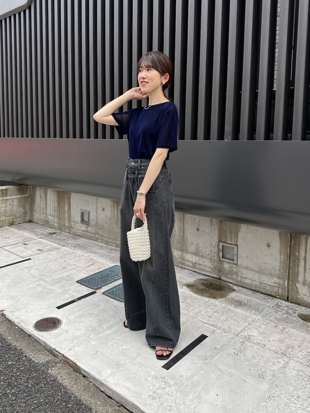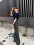 ベロアのように見えて実はメッシュ素材なのですごく涼しく秋の先取りコーデができるトップス。 ウエストのデザインがポイントのデニムと合わせればシンプルだけどおしゃれ見えするよ!