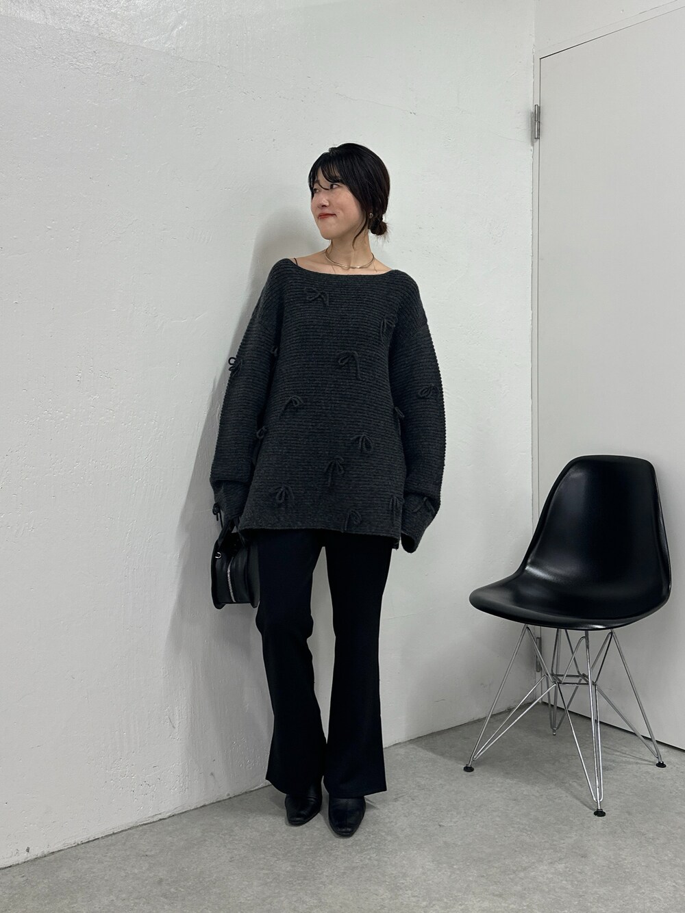 トレンドのリボンモチーフのニット。ざっくりと着られるシルエットが可愛くて一目惚れ。丈が長めなので細身のパンツと合わせるのがオススメ。