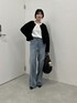 新作の刺繍カーディガンとワイドデニムを合わせたコーデ。インナーのロゴTはブラウス素材できれい目見えするからめちゃくちゃ使い勝手良くておすすめ◎ デニムはTMサイズを履いてます!