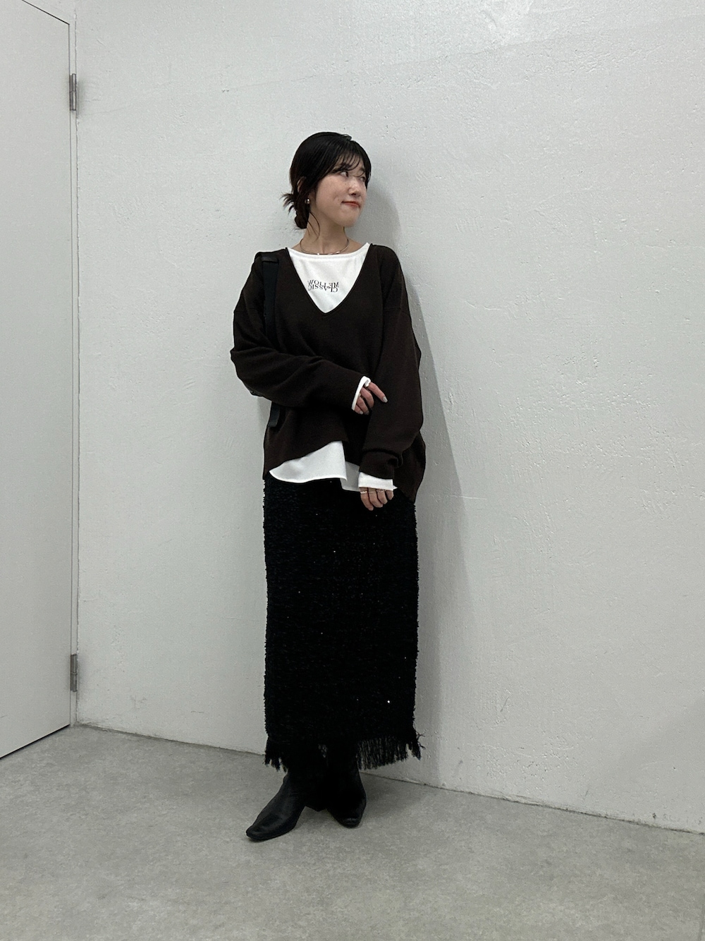 ニットツイードのスカートとVネックのニットを合わせました! スカートがきれい目見えするアイテムなのでロゴTシャツを挟んで少しカジュアルに。
