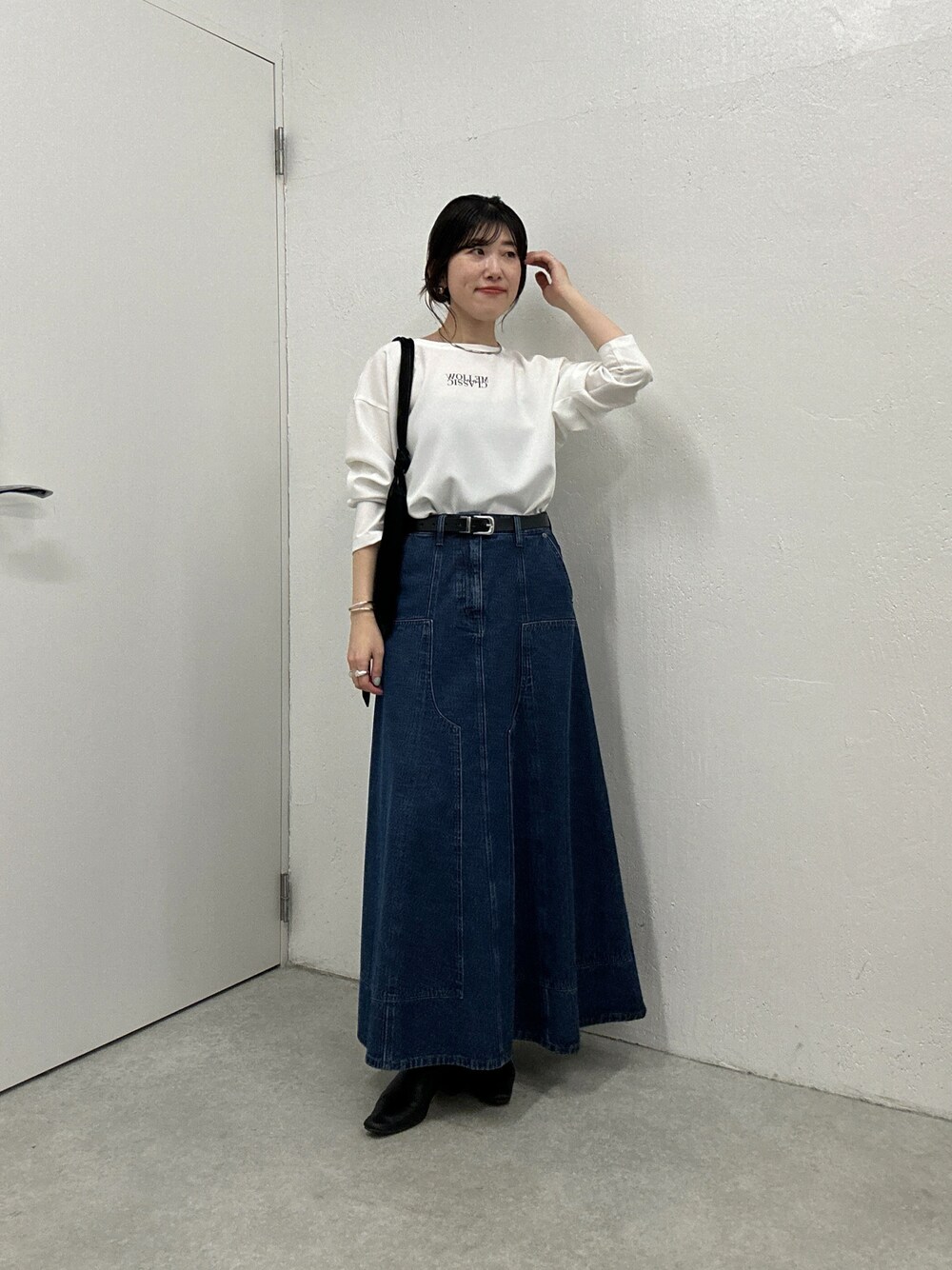 ふわっとしたボリューム感がかわいいデニムスカート。1サイズを履いてますが少しウエストが大きいのでわたしぐらいの体型の方なら0さいずがおすすめです。 ロゴのTブラウスと合わせた春を意識したカジュアルコーデ。
