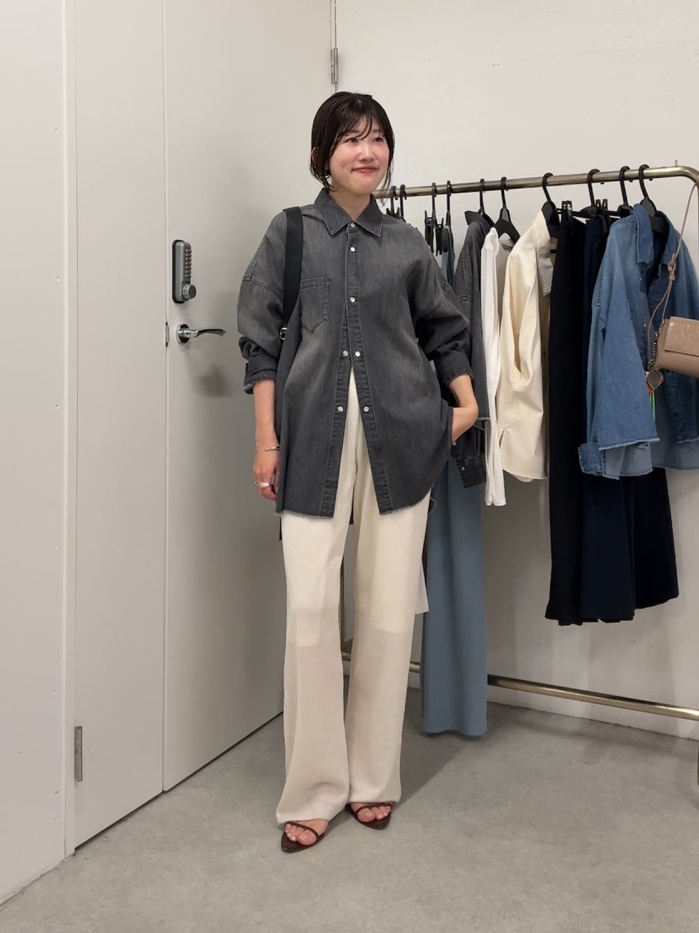ニットのシアーパンツは裏地付きだけどお尻周りとかを出すのは少し抵抗があるって方多いはず! わたしもその1人なのでスナッピングデニムシャツのTMサイズを合わせたらバランス◎でした! シャツは柔らかい素材だから着やすいし、今の季節にちょうどよくておすすめ!