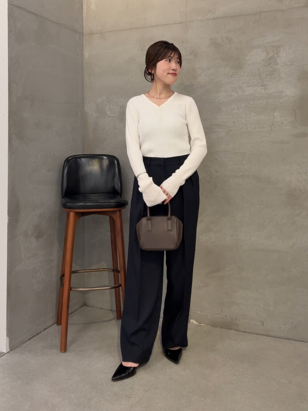 毎年大人気のウールライクシリーズ。 今回は少し素材がシャキッとした感じで、ワイドすぎないシルエットだから小柄な方とかでも挑戦しやすい印象◎ オフィスとかきれいめ使いしたい方にもおすすめですね! コンパクトだけど体のラインを拾わずに着られるヘンリーネックニットを合わせたオフィスにもおすすめのきれいめコーデ。 このニットはめちゃめちゃ着痩せします! シルエットがきれいすぎたので2色買いしようかな!
