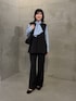 ツイルのセットアップにボウタイシャツを合わせた王道セレモニースタイル。 ボウタイシャツはリボン結びだと甘く見えたりボリュームが出すぎる気がして 二重に巻いて方結びに。この巻き方もおすすめです。 ツイルジレはプリーツのデザインが腰回りを隠してくれておしゃれに体型カバーできる優秀アイテム。 合わせたセットアップ着ができるパンツも、ほのかなフレアシルエットが足を長く細く見せてくれるのでお気に入りです!