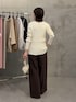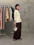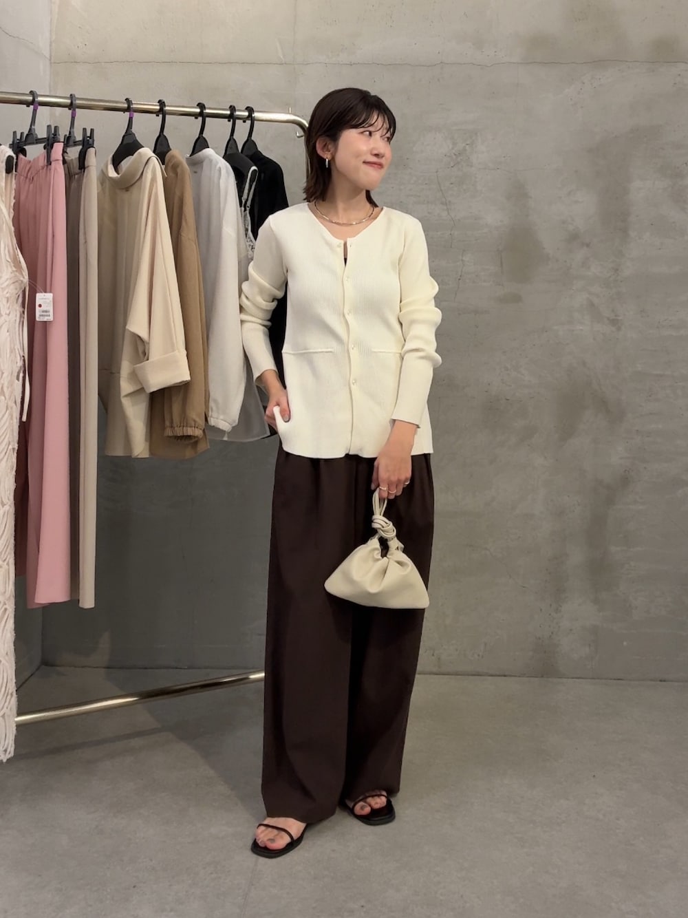 着痩せが叶うリブニット。 胸下の切替部分がくびれを作ってくれてすっきり見えるし、 ペプラムといっても甘すぎないデザインなので大人の女性が着やすいです。 私も普段はペプラム系のトップスは着ないけど、これはお気に入り! よりすっきしした印象で着たかったのでボタンを一つだけ開けてスキッパーのようなデザインにして着てみました。 合わせたパンツはシェルタリングの3タックパンツ。 ぶかっとワイドに履けるシルエットがこなれて見えて好きです。 腰回りまで隠れる着丈のトップスと合わせても、トップス自体がコンパクトなのでバランスよく着られました。 1サイズを着用してかかとが隠れるくらいの着丈です。