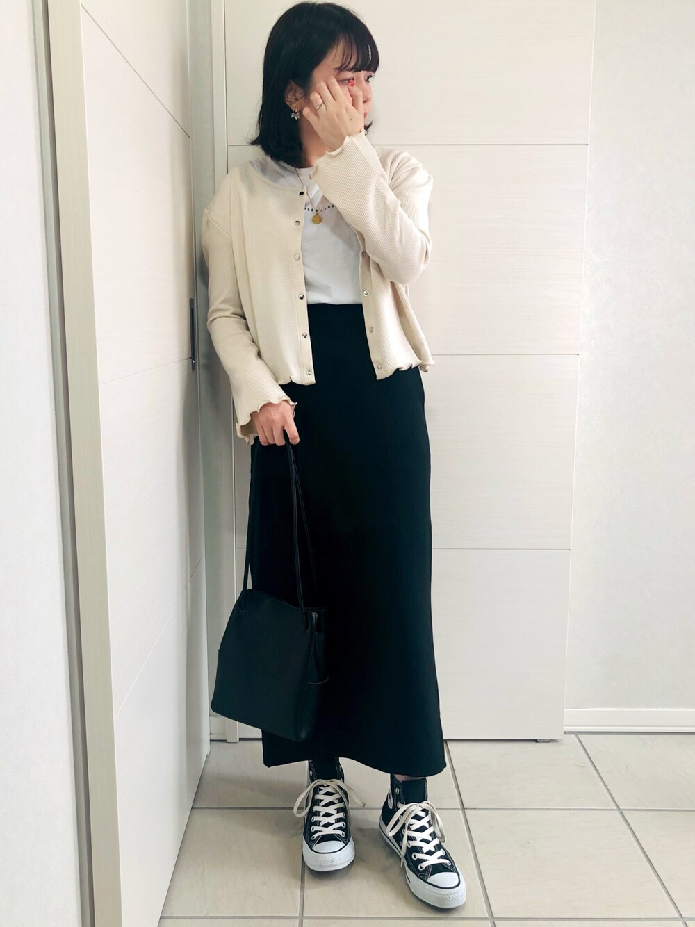 こんにちは♡ 本日2投稿目です♥ ✽.。.:*・゚ ✽.。.:*・゚ ✽.。.:*・゚ ✽.。.:*・゚ ✽.。.:*・゚ 𝗜𝗻𝘀𝘁𝗮𝗴𝗿𝗮𝗺(σ•̀ᴗ•́)σ▷▶︎𝗮𝘀𝗮𝟱_𝟭𝟬𝘄𝗲𝗮𝗿 ✽.。.:*・゚ ✽.。.:*・゚ ✽.。.:*・゚ ✽.。.:*・゚ ✽.。.:*・゚ またまた#モノトーン ♡♥ 【𝚊𝚙𝚛𝚎𝚜 𝚓𝚘𝚞𝚛 𝚌𝚕𝚊𝚒𝚛】 ➪2WAYワッフルカーディガン 今朝着てたカーディガンを着回し🎵 スカートにも合うーーー!! 前を開けても可愛いーーー♡ スナップボタンなのも好き♥ 可愛すぎでしょ、このカーディガン♡ コンパクトなサイズ感がたまらん🎵 【𝙱𝙰𝙽𝙽𝙴𝚁 𝙱𝙰𝚁𝚁𝙴𝚃𝚃】 ➪ BANNER Tシャツ 【𝙶𝚁𝙻】 ➪タイトスカート 【𝙲𝙾𝙽𝚅𝙴𝚁𝚂𝙴】 ➪ コンバース ALL STAR HI オールスター ハイ 【𝙲𝚛𝚒𝚜𝚙 𝚢𝚘𝚞𝚛𝚜】 ➪ポーチセットスクエアバッグ 【𝙲𝙴𝙽𝙴】 ➪ 【CENE】セネ/[ゴールド]エリザベスコインネックレス スカート合わせでも#モノトーン ♡♥ 秋もモノトーンが好き♥ Instagramに着回しコーデ載せてますので、 良かったら見に来てね(*ºωº)σ💕 ご覧いただき、ありがとうございます♡ いいね、お気に入り、フォロー、 とっても嬉しいです♡ ✽.。.:*・゚ ✽.。.:*・゚ ✽.。.:*・゚ ✽.。.:*・゚ ✽.。.:*・゚