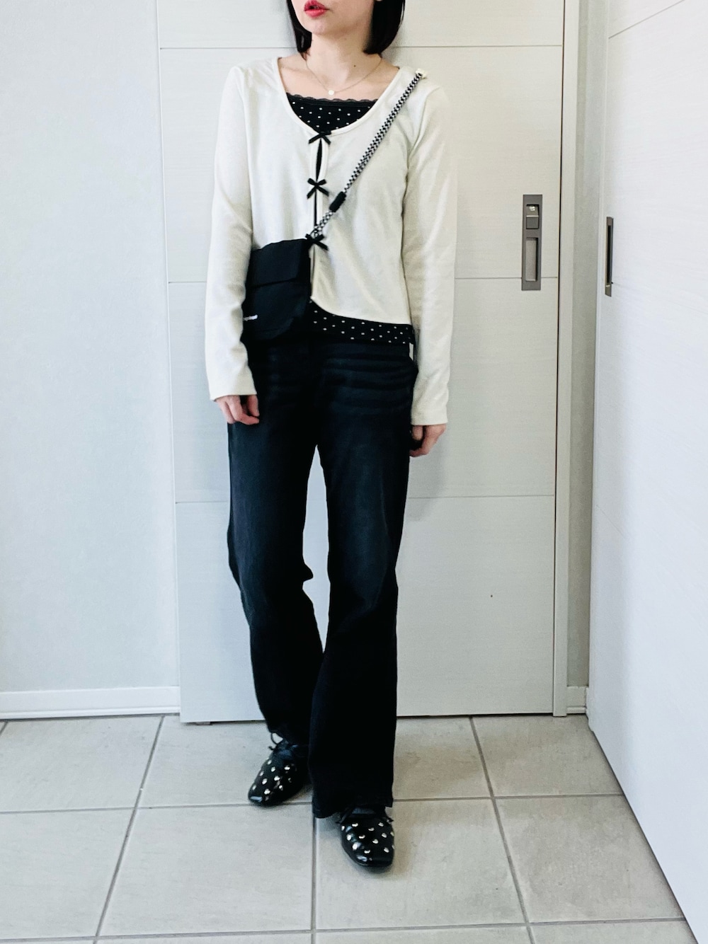 ❁⃘asa❁⃘のTシャツ/カットソー「ドットインナーリボンフェイクレイヤード/ロンT」を使ったコーディネート
