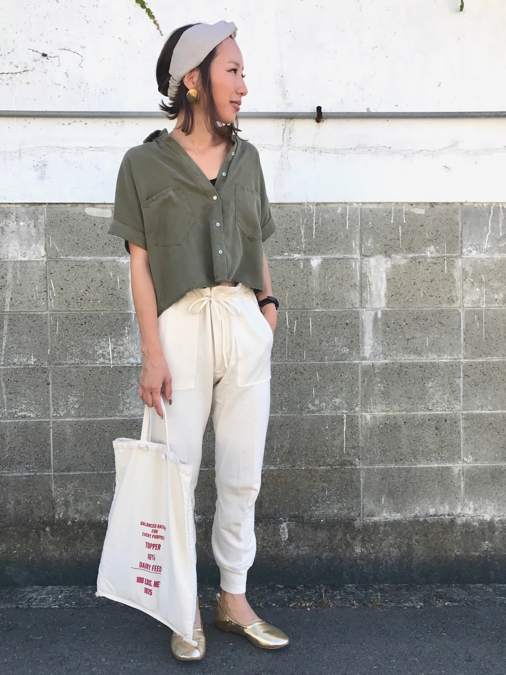 スエットパンツをハイウエストでキュッと絞って、ショート丈のカーキシャツ❤️ このスエットパンツ、真っ白じゃなくてキナリやから合わせやすい😊そしてウエスト部分のデザインが可愛いので、インしたりショート丈のトップスを合わせたい💕 またまたお友達のハンドメイドのピアス✨ゴールドのプレートが可愛い❤️合わせてゴールドのバレエシューズにしたよ😊❤️ トートバッグはこないだのキャナルジーンのクーポンでget❤️ 赤字のロゴ入りのトートバッグ探してたからちょうどよかった😊💕 これもいろんな持ち方できそうやから愛用けってい😋