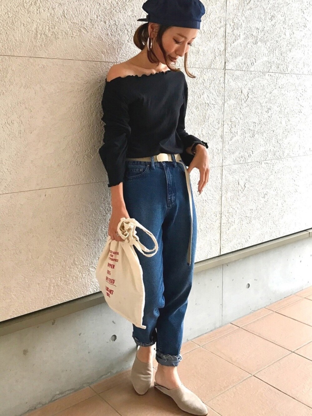 今日は大雨☂️寒かったので長袖❤️ フリルトップスは、ルーズなシルエットが可愛くてオフショルにしたり、色んな着方ができてお気に入り❤️ ネイビーブルーのマムデニムに黒トップス、小物はベージュで合わせました😊💕