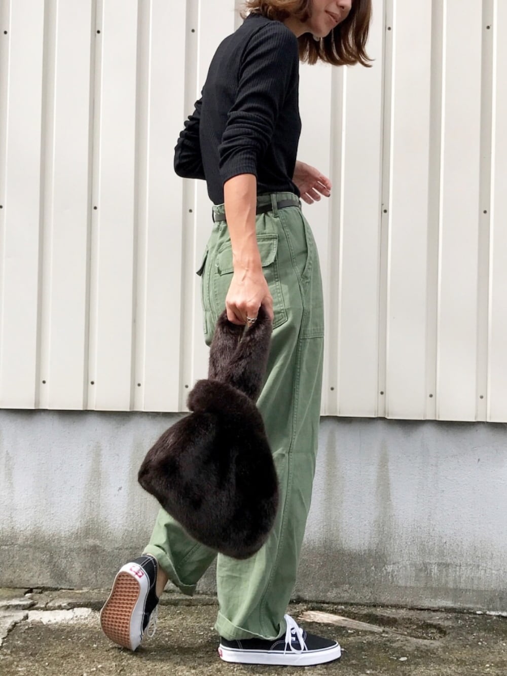 ベイカーパンツにリブハイネックTのシンプルコーデ💓 バッグはブラウンのファー❤️コロンコロンで可愛い💕 今、関西台風スゴイ😱😱早く過ぎ去ってほしいなー💦