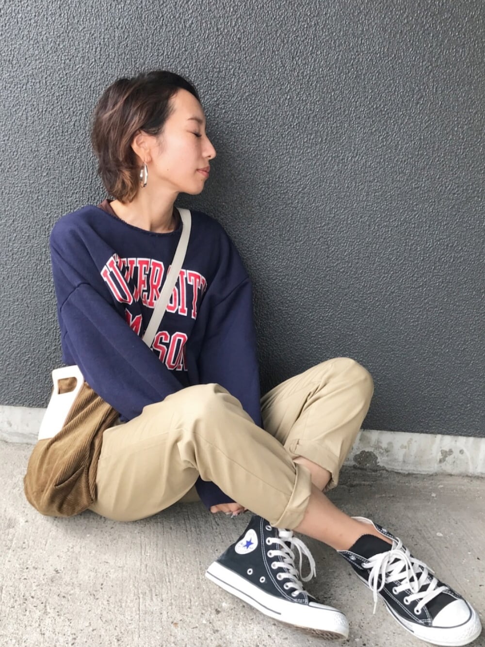 すっぴんですみません😓🙏 今日はマツエクやから、楽ちんカジュアル❤️ チノパンに、ロゴスエットに、スニーカーでボーイッシュ❤️ コーデュロイのショルダーがお気に入り💓
