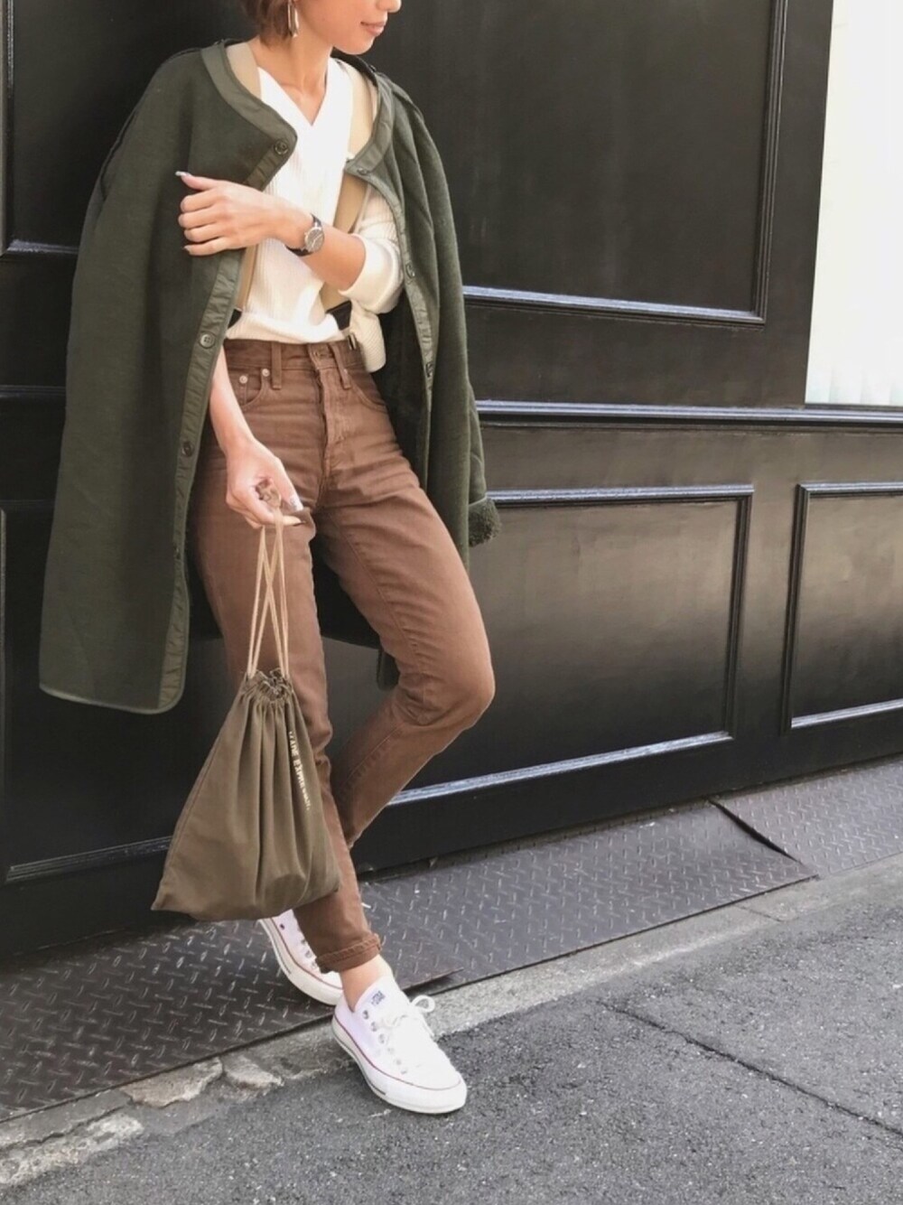 お気に入りのライナーコート💕 インナーは、光りすぎててわかりづらいけど、ワッフルtopsに、ブラウンデニムにサスペンダー❤️ ブラウン、カーキ、ベージュ、ホワイト❤️秋のアースカラー