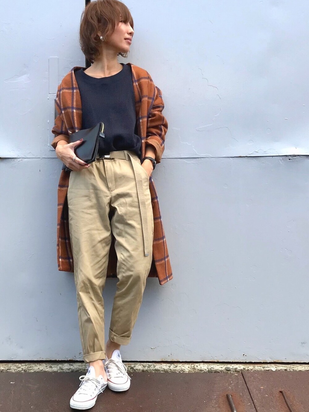 shesonさんのチェックコート💓 3色ある中で、キャメルを選びました!❤️ オーバーサイズだけど、ノーカラーなのですっきり着れます💓 チノパンと久しぶりのワッフルクルーネックtでシンプルカジュアルに合わせました! キャメル、ベージュ、ネイビーの色合わせ😊