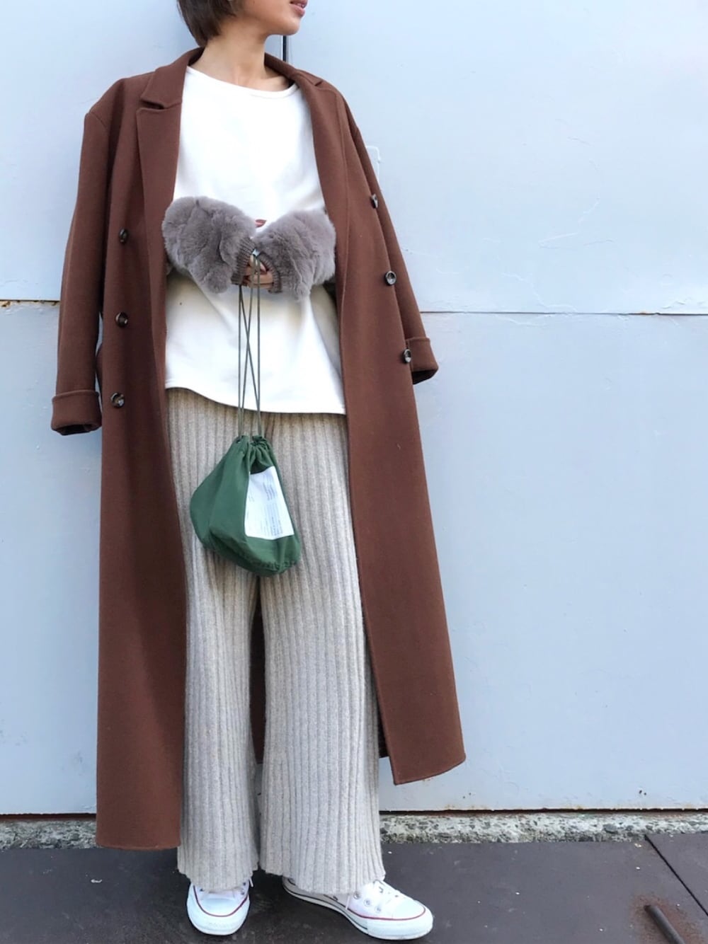 同色カラーのコーデに、ポイントにグリーンのミリタリー巾着❤️ ロングのチェスターコートに、ニットパンツとスウェットの緩い合わせ方も大人っぽくてすき💓 ハンドウォーマーもあったかくて可愛い❤️❤️