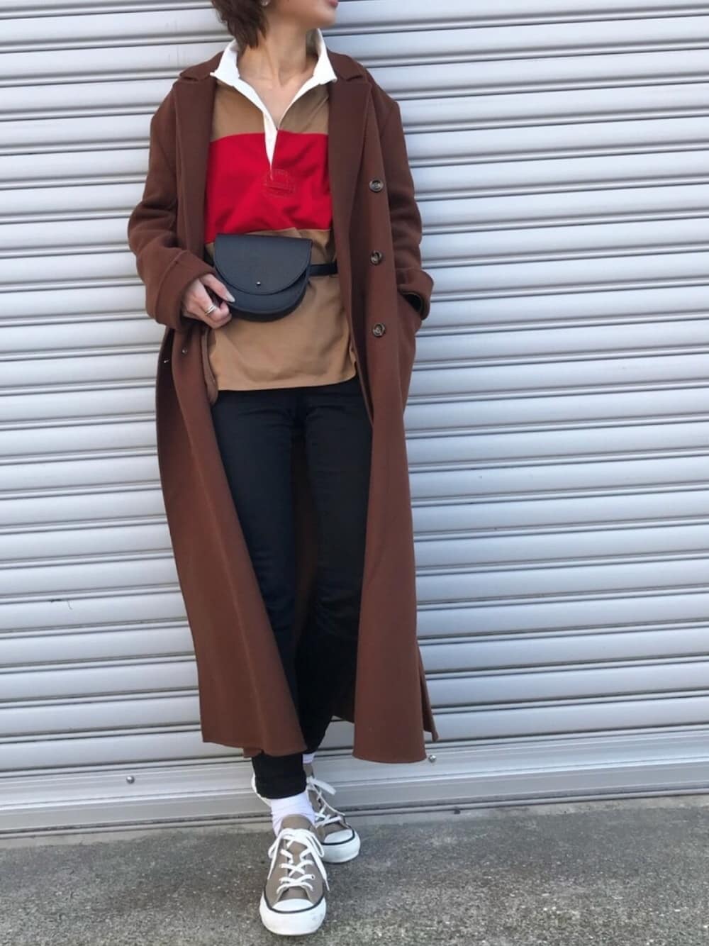 ブラウン✖︎ベージュ✖︎赤 ラガーシャツの上からウエストポーチ♡ アウターはカッチリ♡ インスタ @kumika_iiio2