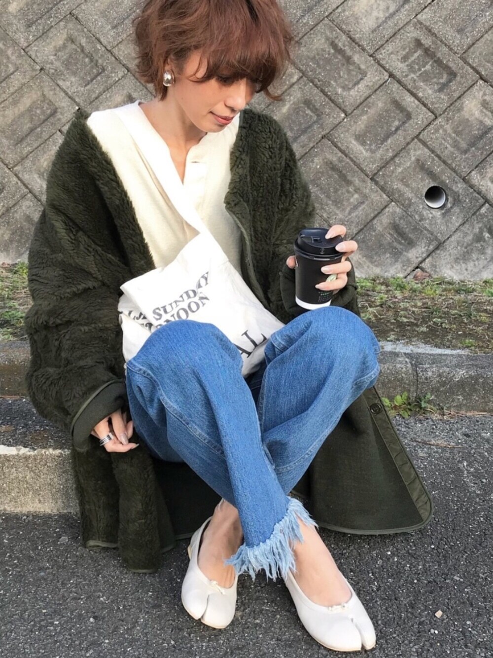 ミリタリーに、足元は白の足袋シューズでちょっと春っぽく♡ 足袋シューズは、前に履いてたブラックの色違いです♡プチプラさん♡ インスタ @kumika_iiio2