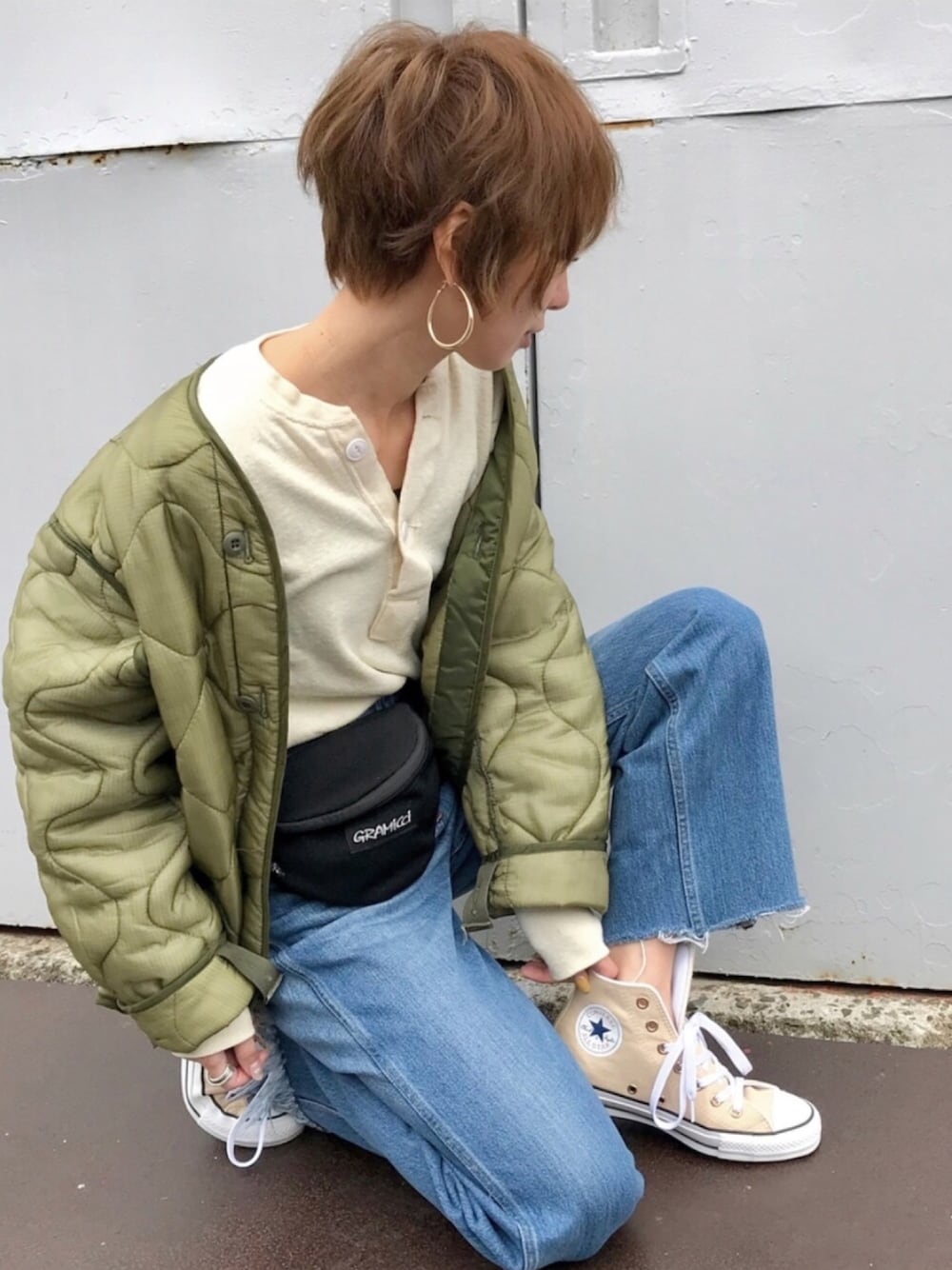 今日は素っぴんなので、後ろ向きぎみ。 マツエクと買い物だけのカジュアルコーデ♡ インスタ @kumika_iiio2