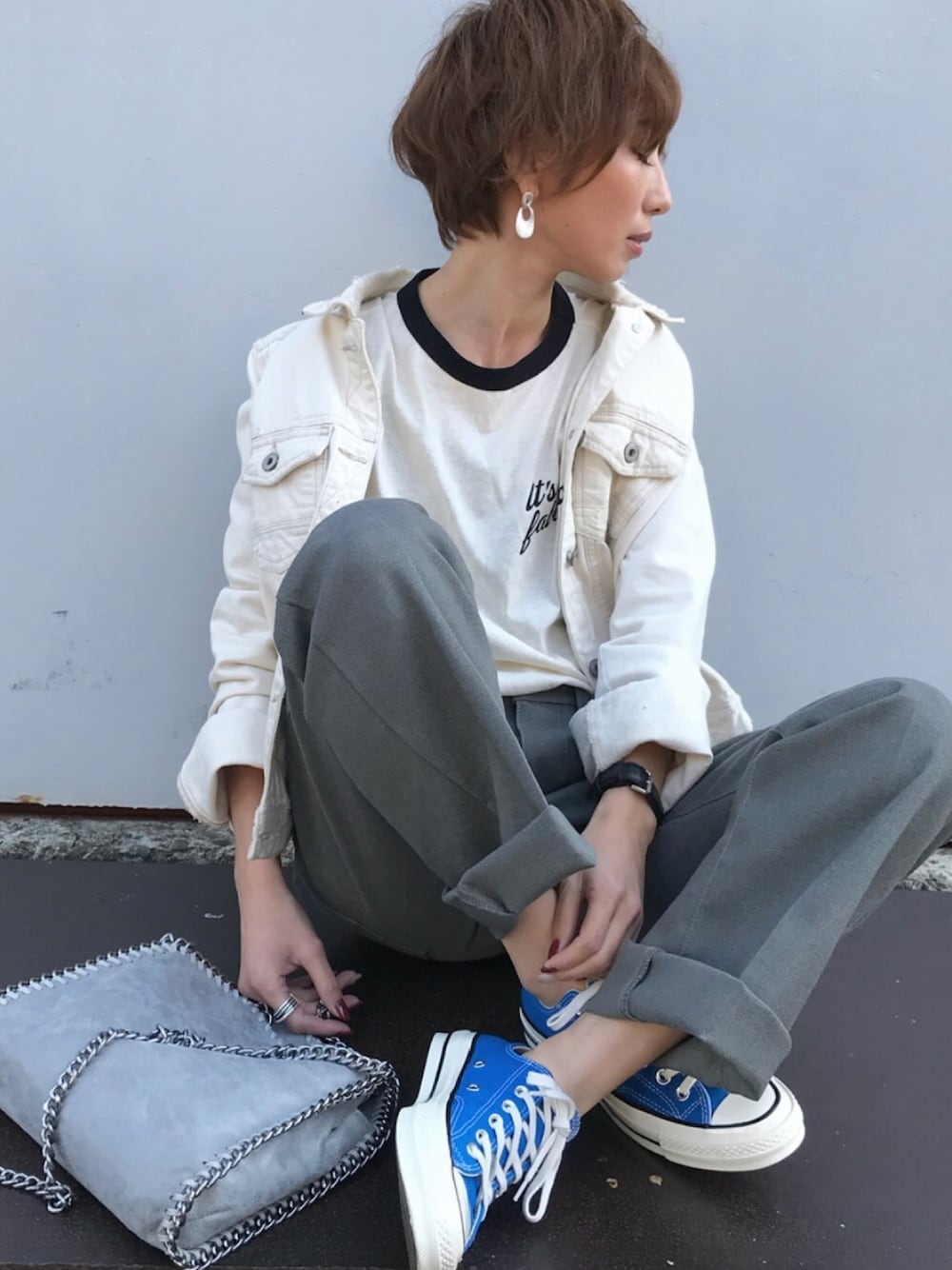 グレーとキナリ❤️ ブルーを差し色に👟 グレーのバッグは、インスタで紹介させていただいてます♡ インスタ @kumika_iiio2