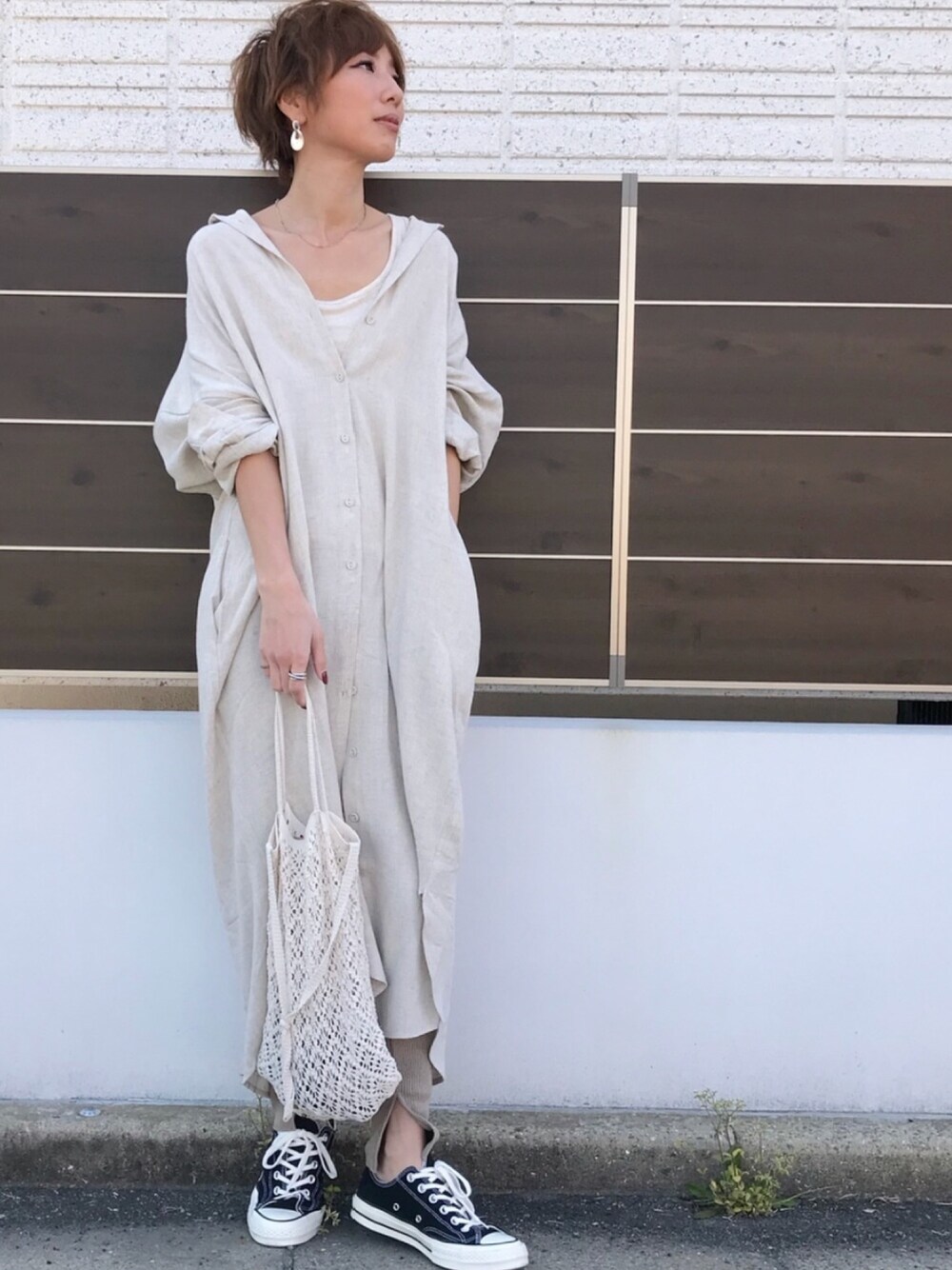 ボリュームたっぷりな麻混素材のワンピースをメインに、アースカラーでまとめました❤️ インスタ @kumika_iiio2