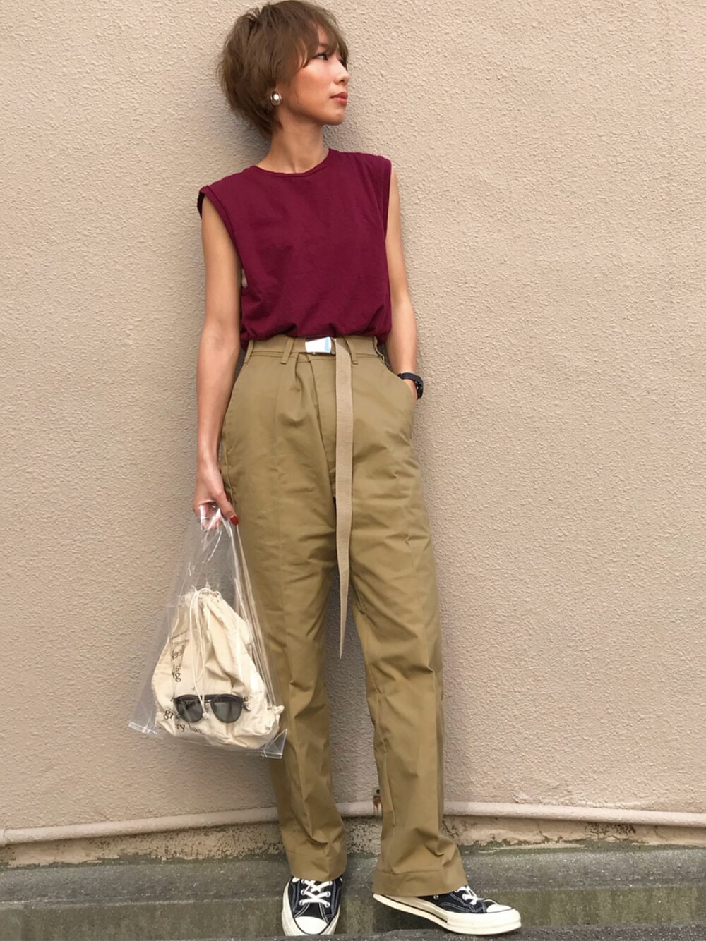 ワインレッドのヘインズタンクに、チノパンをウエストぎゅっ💓 レッド系のカラーとベージュってめちゃ合う☺️💕 インスタ @kumika_iiio2