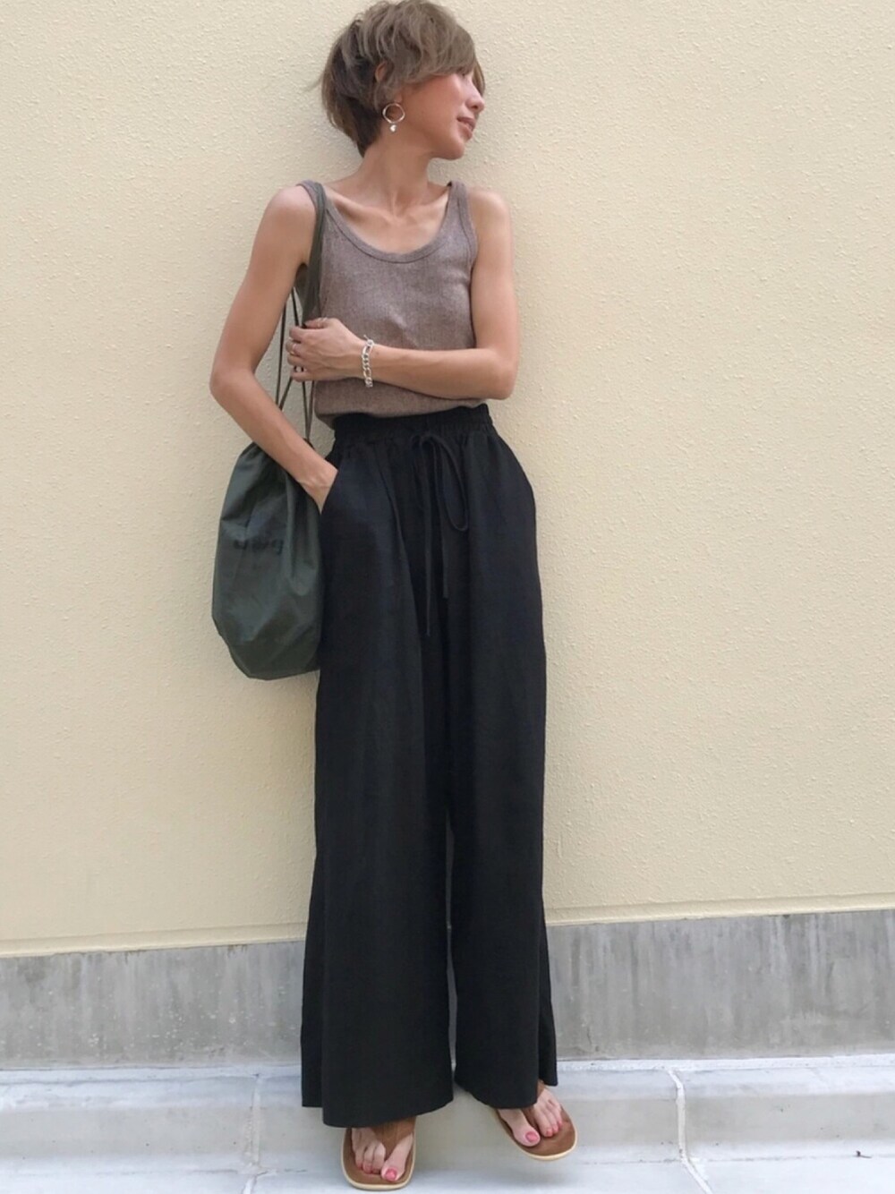 リネンパンツに、タンクトップに、ビーサン❤️ 涼しさと楽さを追求💓 アイランドスリッパ 、商品画像探せなくて、ブラウンで登録してますが、カラーはキャメルです🙏去年のものです❤️ インスタ @kumika_iiio2