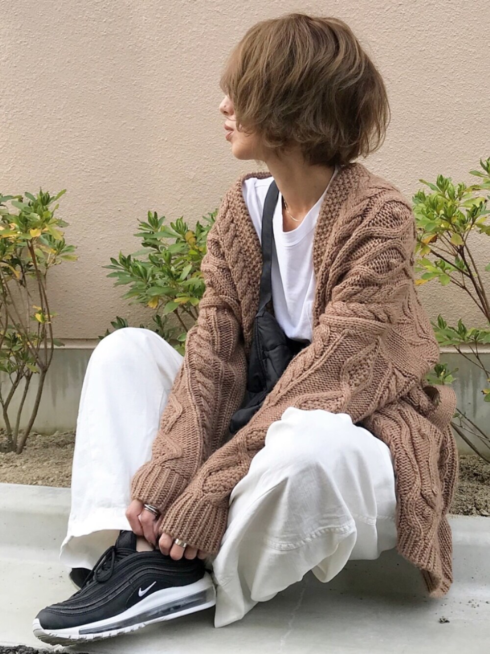 ホワイト✖︎モカ 上下ボリューム合わせなので、バッグと靴は黒で締めました😊 インスタ @kumika_iiio2